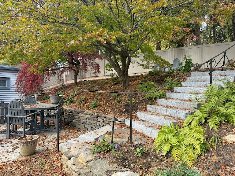 Natural fieldstone wall, stone staircase, and full garden installation. Doylestown, PA.
