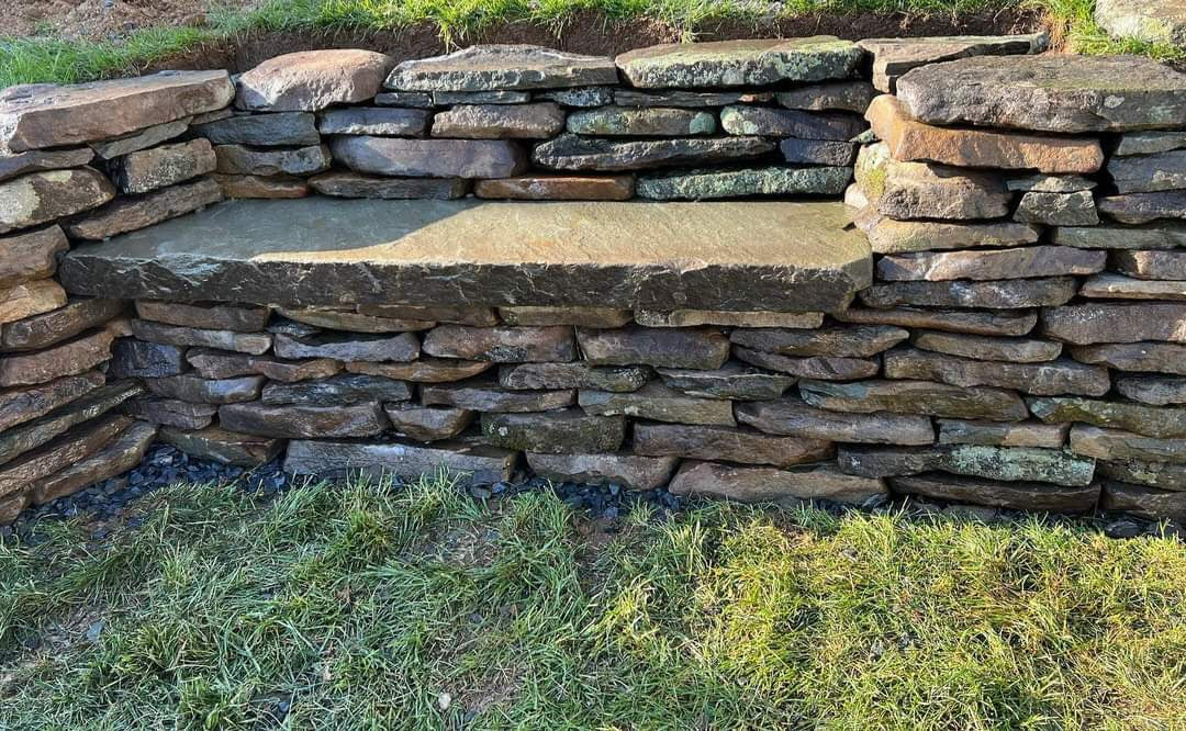 Custom PA Fieldstone wall with built in bench. Allentown, PA.