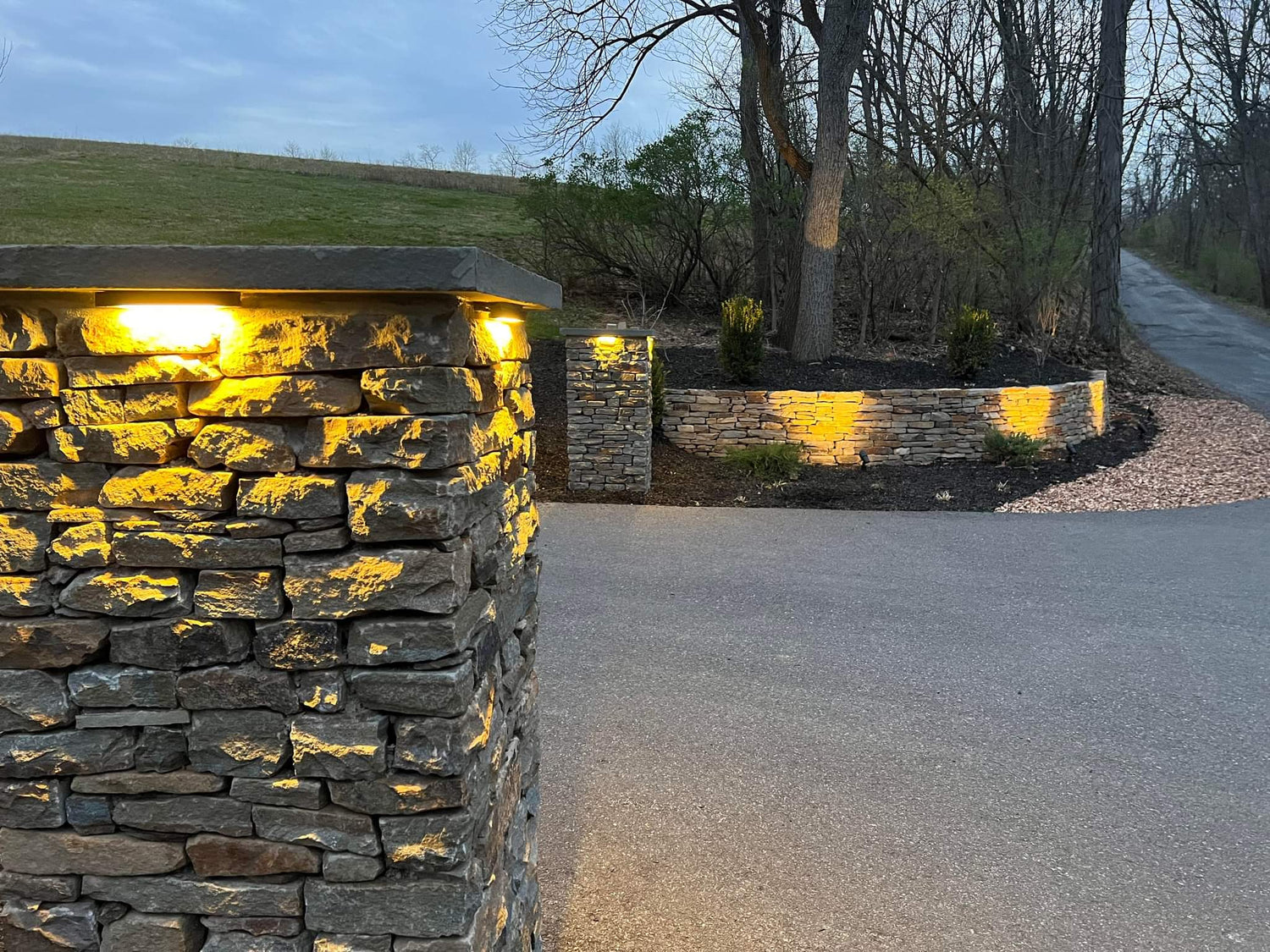 Grand stone pillars with a large retaining wall makes for stunning curb appeal. Gilbertsville, PA.